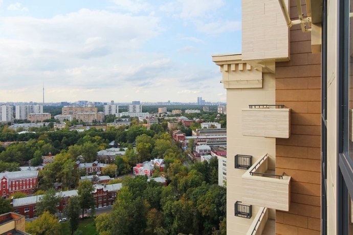Облицовка нижних этажей терракотовым керамическим кирпичом и основной вентилируемый фасад из керамогранитной плитки, стилизованной под травертин.