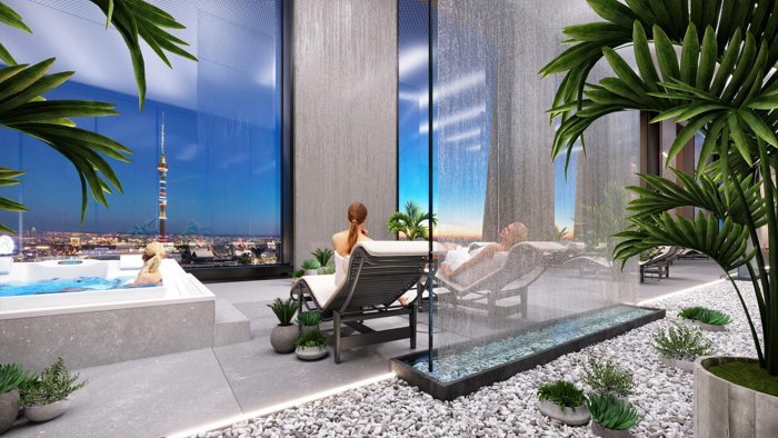 Здесь разместятся: Lounge-гостиная c камином и роялем для спокойного и расслабленного отдыха, многофункциональная детская игровая зона с горками и сухим бассейном для малышей, playroom для подростков, просторные лектории, коворкинг и переговорные, домашний кинотеатр, всесезонное барбекю-патио, Sky spa&relax.